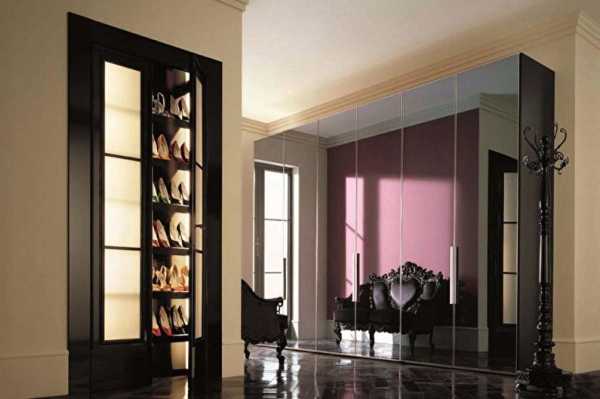 - если входная группа имеет квадратную форму, шкаф с дверками зеркального типа стоит поставить вдоль стены на всю ее протяженность. Если помещение имеет нишу, то стоит подобрать для нее шкаф купе с зеркалом;