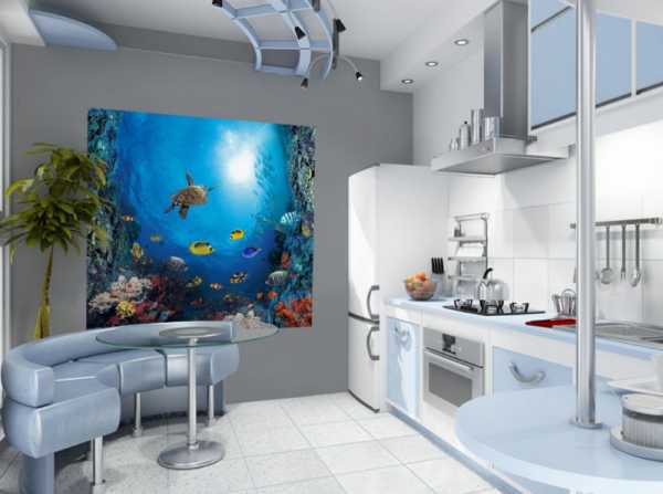 Для отделки тесной кухни можно использовать панорамные обои на всю стену. Особенно привлекательно выглядит фоновое изображение голубого неба или моря. На небольшом пространстве важно соблюдение гармонии цвета, то есть оттенки мебели и фотообоев должны подходить друг к другу.