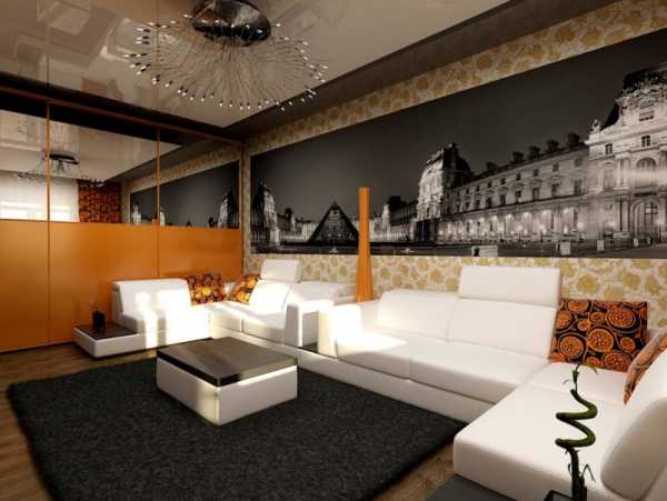 Для современного интерьера в стиле хай-тек идеально подойдут черно-белые фотообои с урбанистической тематикой (городские улицы, площади). Для такого стиля характерно использование минималистической современной мягкой мебели, хромированных светильников и аксессуаров, стеклянных столиков и стоек. Яркие фотообои в стиле минимализм или хай-тек станут доминантой в дизайне гостиной.