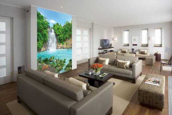 Гостиная является главной комнатой дома и поэтому ее хочется оформить неординарно. Для гостиной изображение на фотообоях следует подбирать, учитывая ее общий стиль. Необходимо помнить, что фотообои влияют на настроение и атмосферу помещения, поэтому лучше не использовать необычные навязчивые изображения. Цвет тоже может сказываться на общем восприятии – интерьер становится светлым или темным, теплым или холодным. Если в гостиной недостаточно светло, то выйти из положения можно с помощью обоев с солнечным зимним или летним пейзажем.