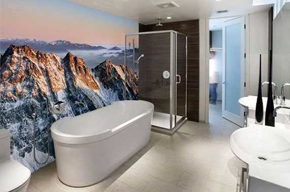 Казалось бы, ванная комната – неподходящее место для размещения фотообоев, поскольку здесь все привыкли видеть керамическую плитку. Однако именно они являются отличным способом сменить обстановку в данном помещении, это экономичный вариант, не предполагающий также больших затрат времени.