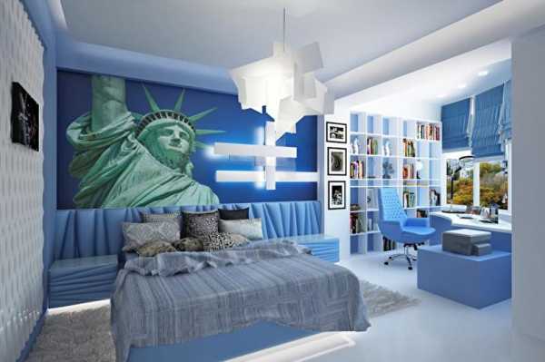 Длина полотен фотообоев (до 10 метров) позволяет оклеить сразу две смежные стены. Но, в этом случае, чтобы избежать визуальной перегрузки, надо использовать минимальное количество корпусной мебели.