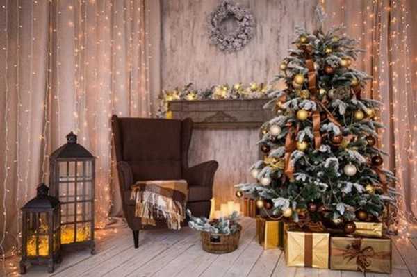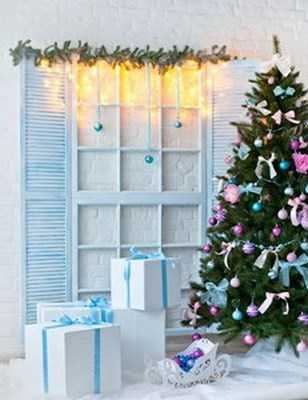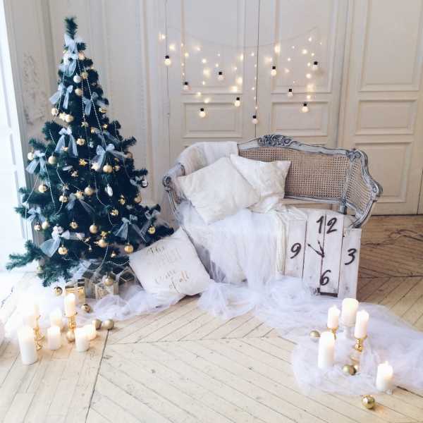 Каким бы ни был выбранный стиль новогодней фотозоны, в нем обязательно должна присутствовать наряженная елка или хвойные веточки. Убранство новогоднего деревца должно соответствовать стилю и быть оригинальным. Не стоит вешать все игрушки, которые имеются, лучше выбрать украшения одного или двух оттенков. Никак не обойтись и без иллюминации. Гирлянды сейчас можно купить как цветные, так и одного тона.