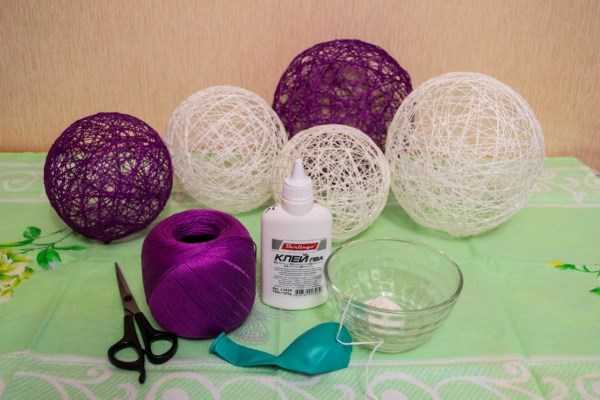 Одним из простых и очень интересных вариантов создания шаров является использование ниток для вязания, клея ПВА и воздушного шарика. Макая нитки в клей, нужно обматывать ними воздушный шарик. Дать клею высохнуть, оставив на несколько часов. Потом шарик сдуть и достать. В результате получится кокон, который можно украсить бусинами, цветами или лентами.