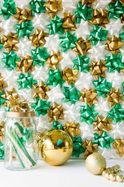 Альтернативный вариант — фотозона из бантиков для подарков. Сделать ее очень просто, поскольку такое украшение для подарков крепится к двустороннему скотчу. Вам понадобиться только наклеить их на любую поверхность.
