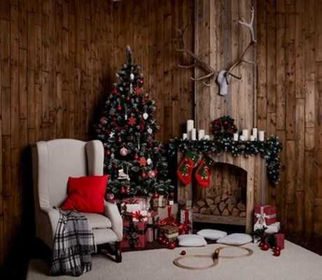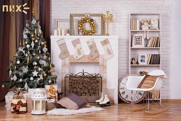 Для любителей домашнего уюта есть еще один вариант оформления — каминный портал, рядом с ним ёлочка, окруженная подарочными коробками, полка-стремянка с книгами и фоторамками. Теплоту и уют домашнего очага символизируют изображения дров в портале и удобное кресло с вязаными сидениями-подушками.