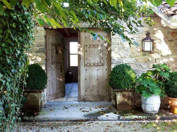 Каменные элементы строительства теперь и является основой домов в стиле прованс. Максимальная защита фасада от ветра также привела к тому, что вход в дом крайне редко оформляется крыльцом или портиком. Чаще всего это просто очень массивная дверь, которая открывается прямо на дорожку.