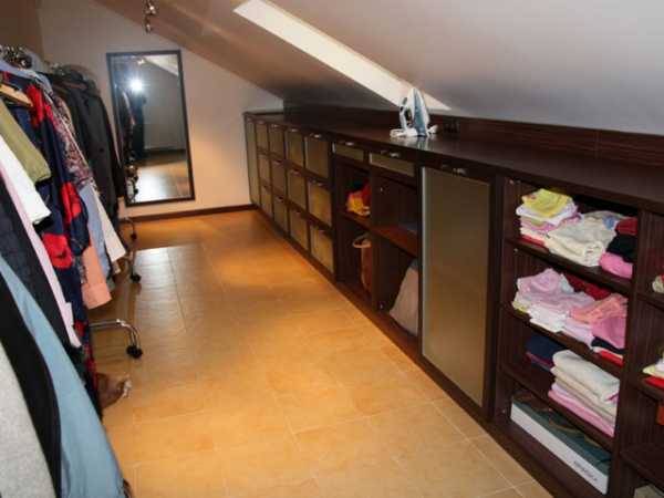 - Как правило, мансарда – очень большое помещение, где без труда поместится даже крупная гардеробная система. Одежда всей семьи поместится сюда, еще запас останется. К тому же, здесь можно будет хранить не только вещи