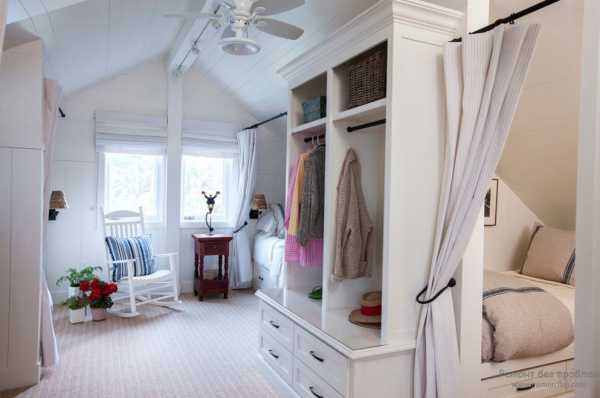 Если спальная комната расположена на мансарде или чердаке, то перспектив для воплощения своей мечты открывается гораздо больше, т.к. сразу появляется множество дизайнерских вариантов. Например, разместить кровать у наклонной стены, а гардеробную обустроить вдоль высокой, при этом, неплохо дверцы сделать раздвижными или «гармошкой». Кстати, такие двери очень удобны, т.к. перемещаются они по направляющим, отделяющим пространство от стены на протяжении всей длины спальни.