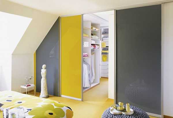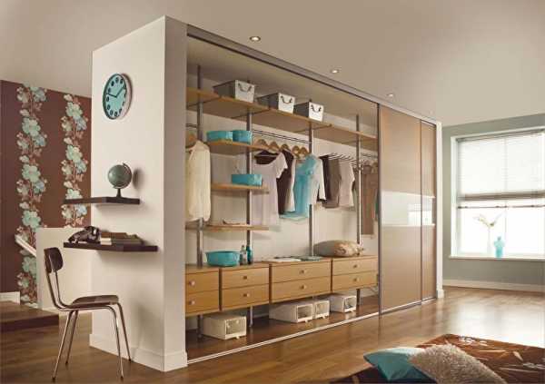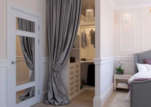 В качестве перегородки между гардеробной и комнатой может выступать занавеска или раздвижная дверь