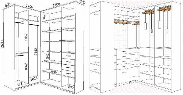 Перед тем как сделать гардеробную из кладовки, продумывают систему хранения и отображают её на план-схеме. Делать проект необходимо в точном соответствии с размерами. Делают эскизы с разных ракурсов для облегчения работы. На последнем этапе планировки рассчитывают расход материалов необходимых для переделки.