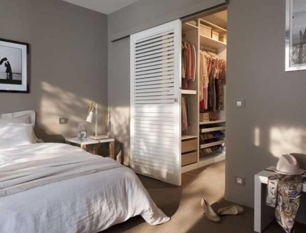 Гардеробная комната в спальне может быть оборудована простым разделением спальни на 2 части при помощи дверей. Лучше всего использовать раздвижные двери или двери типа купе – они не требуют места для их открытия.