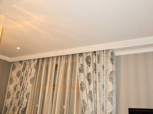 Натяжной потолок. При установке тканевого потолка, гардина крепится одновременно с ним, но если повесить её нужно позже, то придётся применить метод монтирования на стену.