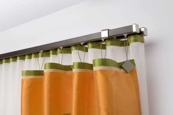 Для помещений с невысокими потолками разработали специальные крепления для текстиля, которые в последствии получили название гардины для штор. Они способны зрительно увеличить расстояние от потолка до пола. Конструкция помогает спрятать место крепления штор.