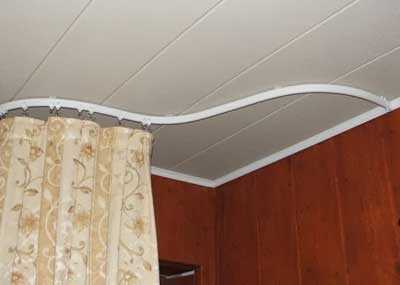 - Гибкие гардины. Такое решение очень актуально для ванной комнаты. Так, вместо угловой штанги можно установить на потолок гибкий профиль, или даже подчеркнуть нестандартную форму ванны.