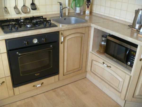 Это один из самых удобных вариантов, но возможен он только в том случае, если вы планируете покупать новый кухонный гарнитур в котором заранее необходимо предусмотреть нишу для микроволновой печи нужного размера. При таком варианте размещения печь не будет занимать место на рабочей поверхности, кухонном столе и пр. Однако она займёт часть полезного пространства в одном из шкафов.
