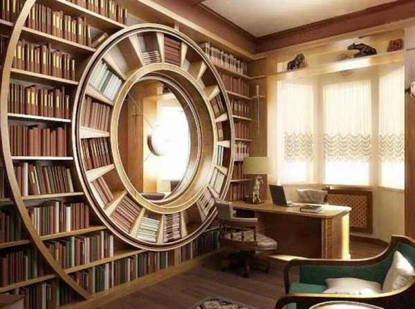 Но такая мебель для интеллектуалов не станет оптимальным решением для чересчур маленькой комнаты. Большое количество книг и громоздкий стеллаж будут нести ощутимую визуальную нагрузку. Если же никак не удается отказаться от задумки, оформляйте интерьер в светлых тонах, с легким декором и мебелью утонченной формы.