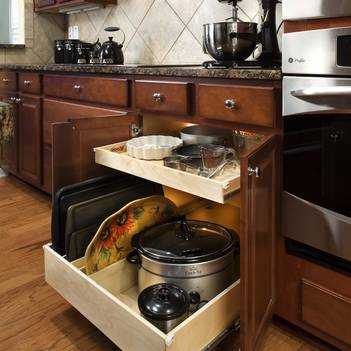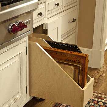 Dura Supreme Cabinetry, © HouzzКастрюлям и крышкам на кухне часто приходится разлучаться из-за большого диаметра и крупных габаритов. Всё бы ничего, но в самый неподходящий момент пара часто теряется. Чтобы собрать крупную утварь в одном месте, огородите пространство для крышек узким карманом внутри общего большого ящика. При таком расположении вам будет хорошо виден диаметр посуды.