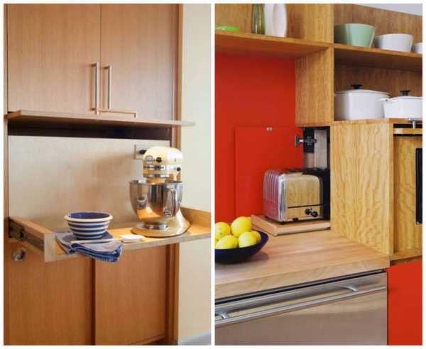 Фактически, мелкие приборы (тостер, миксер, блендер) прячутся в небольшой встроенный или выдвижной «гараж». Таким образом их невидно, плюс в случае необходимости их можно легко достать. Вот несколько фото-примеров таких отсеков.