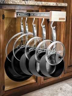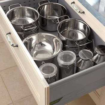 Также можно заказать специальный гарнитур с разделителями — он поможет разложить посуду по размерам и не путаться в ней. Легкий и удобный способ поддержать порядок, но довольно дорогостоящий. Альтернатива — сделать разделитель самому, используя металлическую сетку. Крышки удобно хранить в специальной сетке Блюм, которая цепляется на любую вертикальную поверхность.