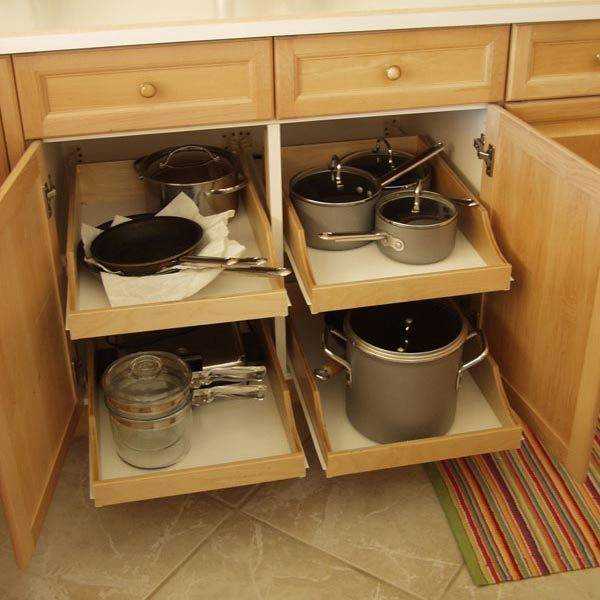 И напоследок, идея для хранения крупной утвари: кастрюль, сковородок, пароварок и т.п. Использование таких вот полок существенно упростит доступ к большим и тяжелым кастрюлям.