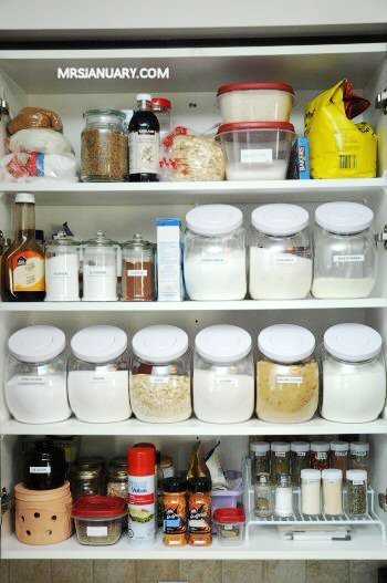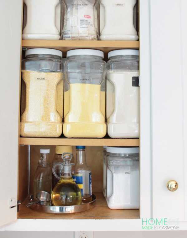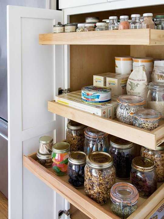 Начнем с самого популярного — с баночек. Когда баночки одинаковые — это смотрится очень аккуратно. Если они не одинаковые, можно просто ставить их за глухими дверцами 🙂