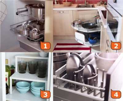 Дополнительные полочки, которые позволяют использовать всю высоту полки и крутящиеся подставки помогут сэкономить место в шкафах.