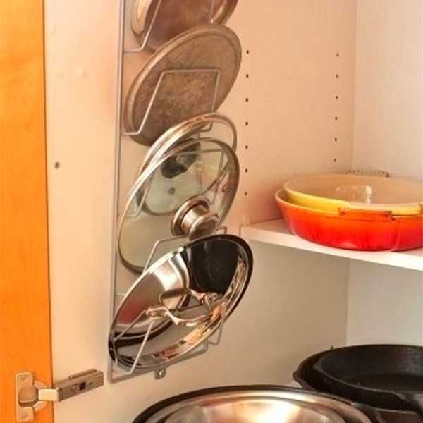 Зачастую именно крышки отбирают у нас важное пространство на кухне: либо неэффективно занимают целый ящик, либо не дают хранить кастрюли одну в другой. Попробуйте организовать место для крышек на дверце кухонного ящика. Для этого подойдет небольшой рейлинг, вешалка для полотенца или даже крючки на липучках.