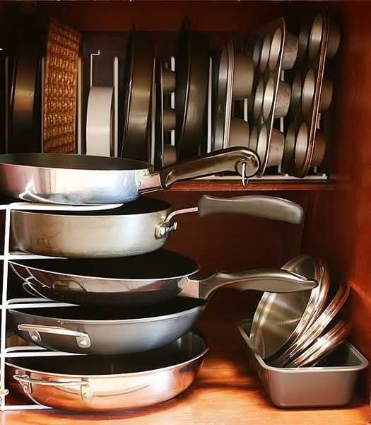 Кстати! Тефлоновую и керамическую утварь рекомендуется хранить именно так — это помогает предотвратить царапины.