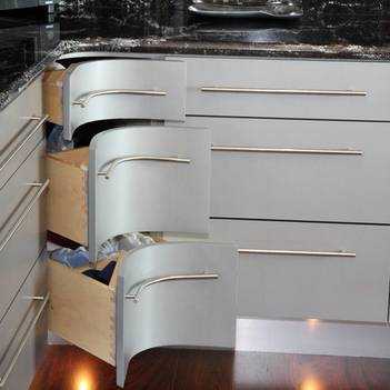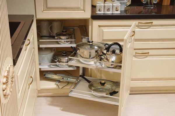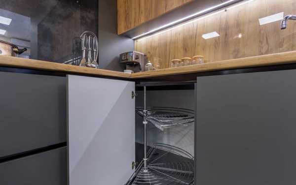 Сейчас речь идет не только о стандартных гарнитурах, где можно оборудовать выдвижные полки, не занимающие много места. Многие мебельные компании производят п- и г-образные кухни, в которых углы оформлены особым образом — в виде полок сложной формы. Таким образом вы легко приспособите под хранение место, которое раньше просто простаивало.