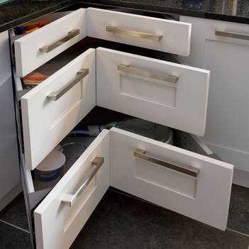 PTACEK home, © HouzzУгол типового гарнитура — это, пожалуй, самое загадочное место на кухне. Обычно здесь живут сковородки, которые вам жалко выбросить, хотя давно пора, или утятница, которую вы достаёте раз в год. Чтобы драгоценные метры не пропадали зря, дополните угловой шкаф поворотно-выдвижной корзиной или полкой-каруселью. И то и другое можно встроить в готовую кухню, а комплектующие найти у большинства производителей.