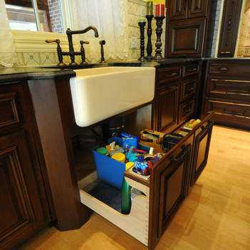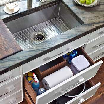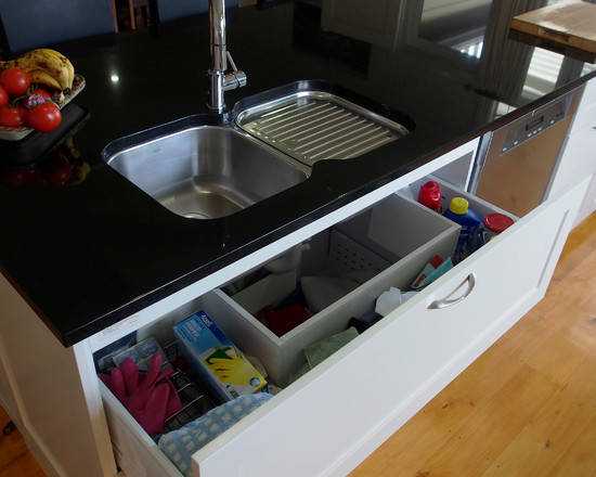 Design Set Match, © HouzzПопробуем угадать: трубы, мусорное ведро и зловещий склад бытовой химии. Учитывая глубину кухонного гарнитура, вы, скорее всего, давно забыли, что скрывается у стенки, не говоря уже о том, чтобы лезть под раковину с головой и делать уборку в углах. На помощь приходит самый простой выдвижной ящик с невысокими стенками, как на фото. Цена комплектующих — как за два обеда в кафе плюс минимум трудозатрат.