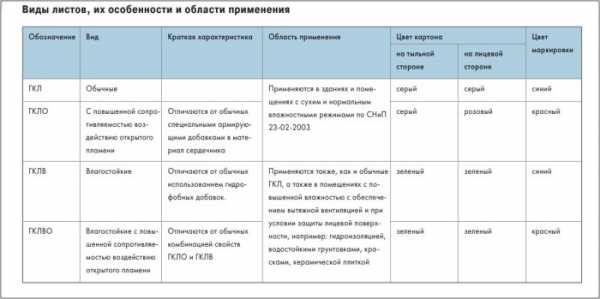 Сферы применения различных типов ГКЛ