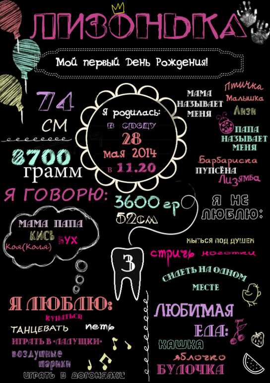 Сценарий взяла готовый, закачала на планшет-удобно. Праздник построила так: когда гости сели за стол, показали слайд-шоу, затем тост от меня и папы, потом бабушки-дедушка, крестные и пострижение первого локона, затем гадание на будущее. Чуть позже провела конкурс Гурман и кто лучше знает именинницу. Где-то в середине праздника попросила гостей заполнить плакат похожести и анкету на 18-летие. А когда гости стали собираться уходить, предложила оставить пожелание на Дереве пожеланий.