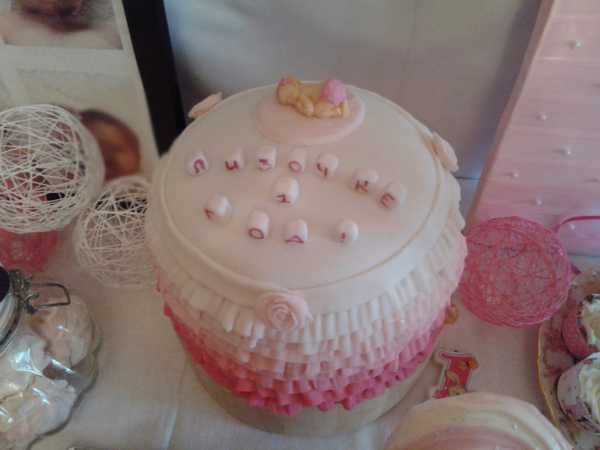 Торт делала сама. Заказала на ebay молд-форму малыша и утюжок для мастики. Саму мастику заказывала в интернет-магазине доставки кондитерских ингредиентов. На такой тортик ушло 1.5 кг мастики( я взяла с запасом 2кг). Испекла 2 коржа в мультиварке, сделала два крема. Первый для прослойки сливки с маскарпоне и пудрой. Прослаивала им и добавила 2 слоя груш. А выравнивала вареной сгущенкой с сливочным маслом. Сверху уже покрывала мастикой. Надо было бы еще гелевые краситель купить, а то с сухими очень проблематично красить мастику.