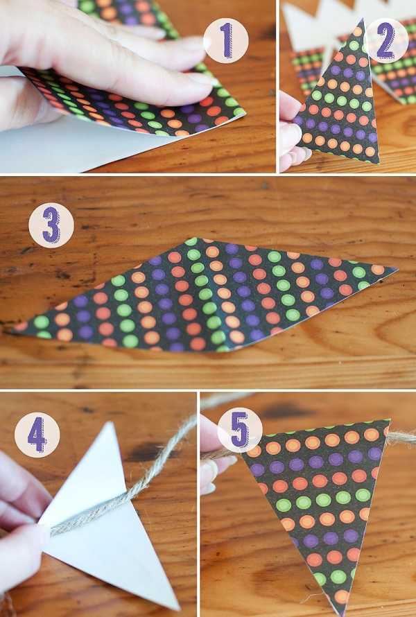 Совет! Обязательно меняйте цвет и рисунок бумаги, чтобы сделать гирлянду более яркой, а также учитывайте расстояние между флажками для более эстетичного вида изделия.