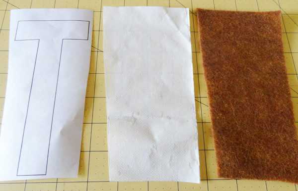 - Теперь будем делать буквы более толстыми, чтобы они имели лучший вид и не так скручивались на веревке. Для этого кладем буквы из ткани на еще один слой фетра или войлока и утюжим.