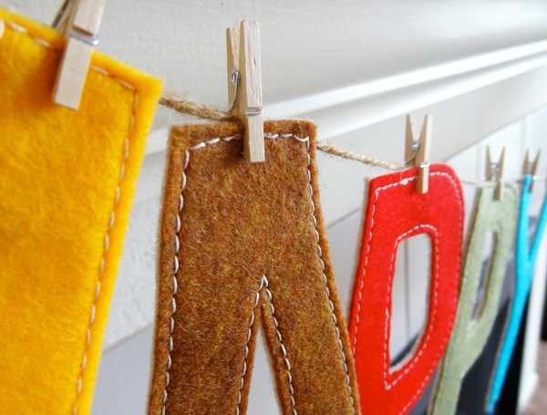 - Развешиваем длинную веревку, закрепляя ее концы к стене. Прищепками цепляем к ней каждую букву в нужной поочередности, чтобы получилась выбранная надпись.