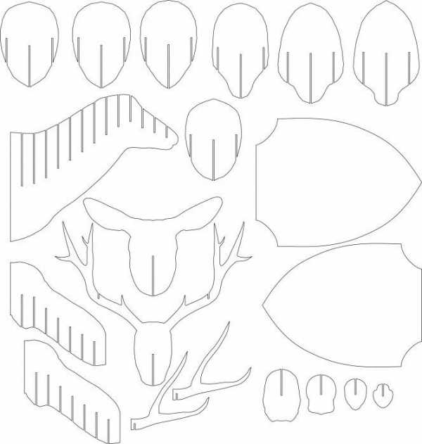 Пожалуй, начнём с наиболее распространенного охотничьего трофея и рассмотрим чертежи головы оленя из фанеры. Изготовление оленя, равно как и прочих животных, это создание своеобразного 3D-пазла. То есть, из пиломатериалов изготавливается определённое количество деталей, которые собираются в единое сооружение.