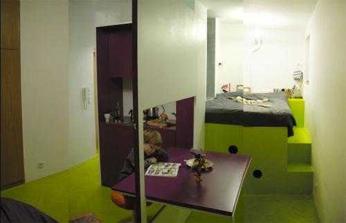 Это может быть выдвижная кровать. Она одновременно может быть подиумом для визуального зонирования помещения, а под ней возможны ящики для хранения вещей. Подъемная кровать занимает совсем мало места. Она легко опускается на ночь, а в дневное время у вас достаточно места для приема гостей. А можно даже постараться и найти целую кухню-трансформер, которая в зависимости от ситуации будет разделять или объединять пространство.