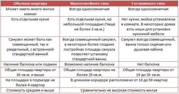 Теперь поговорим о различиях в этих широко распространенных понятиях. Большинство людей думают, что это просто разные названия одинаковых квартир. Но это не так. Мы составили для вас таблицу, показывающую различия между квартирами малосемейного и гостиничного типа, а также включили в нее отличия от обычных квартир.