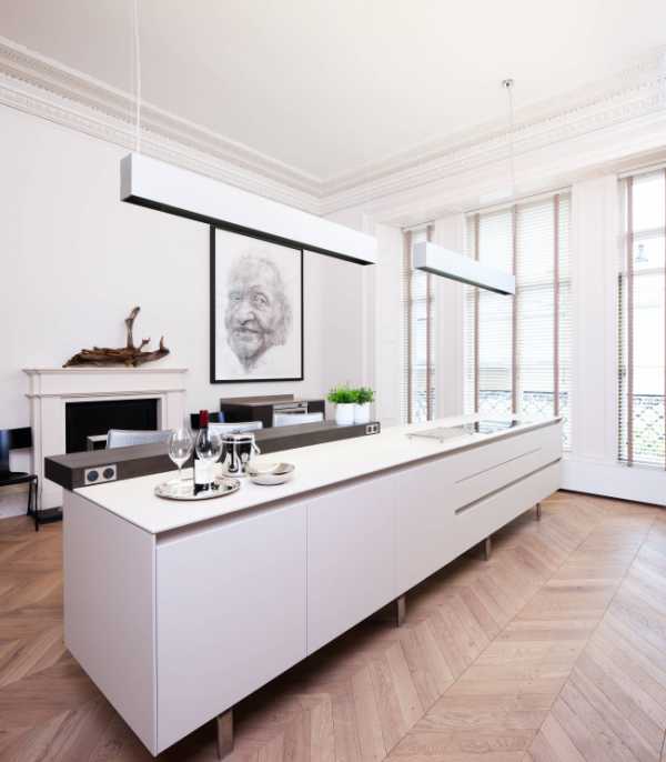 Белые глянцевые фасады и отсутствие ярких деталей помогают кухне выглядеть просторно и светло, несмотря на то, что рядом нет окна. Дизайнер отказалась не только от рейлингов и полок, но даже от ручек на дверцах — они открываются нажатием.