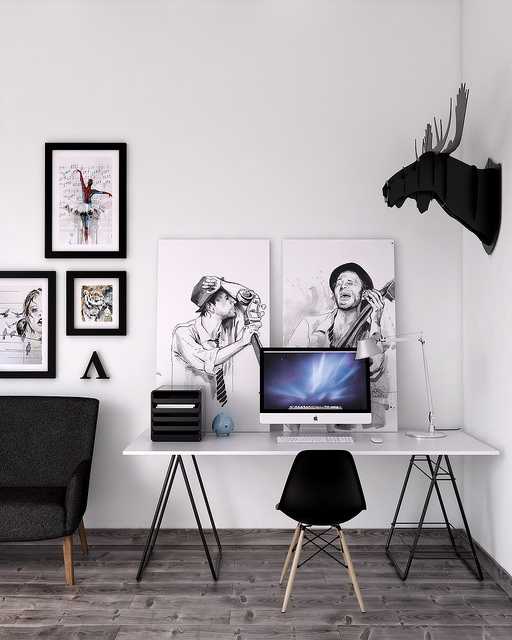 Графика как нельзя лучше подходит для обустройства рабочего места. Черно-белая палитра помогает сосредоточиться, заняться творчеством и не отвлекает внимание. Кроме внесения в интерьер комнаты некоторой новизны она может быть использована в таком качестве:
