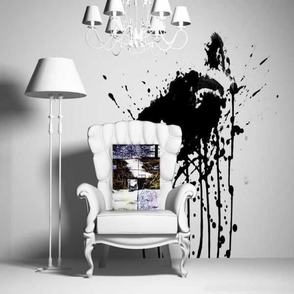 - В виде яркого рисунка, исполненного в технике аэрографии. С помощью аэрографа мастер может нанести любое изображение на металлическую, стеклянную, деревянную панель или идеально ровно оштукатуренную стену. За счет умелого сочетания черных и белых красок профессионалы создают изумительно красивые графические рисунки, с которых сложно перевести взгляд на другую деталь обстановки. Поэтому, чтобы окружающие предметы интерьера не меркли на фоне динамичных изображений, стоит дополнить композицию аккордами в виде красно-белой или желто-черной обивки кресел, штор зеленого или синего цвета, невольно отвлекающих внимание от безупречно исполненной графики на стене.