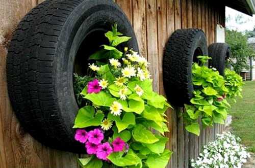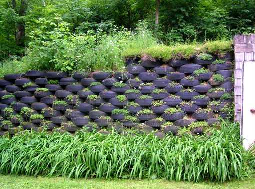 Из отработанных автомобильных шин получаются прочные подпорные стены, способные удерживать грунт от сползания. Стоимость таких стенок гораздо ниже традиционных, а время на строительство — меньше. Покрышки укладывают в шахматном порядке и засыпают землей. Для высоких стен покрышки насаживают на вертикальные сваи (каркас). Верхние ряды крепят к ним с помощью хомутов. Шины скрепляют между собой с помощью крепкой проволоки. В образовавшиеся кармашки можно насыпать землю и высадить ампельные растения. Получится необычная цветущая стенка. Хороши также невысокие заборчики и ограждения для цветников и грядок из вкопанных в землю покрышек, раскрашенных в разные цвета.