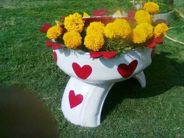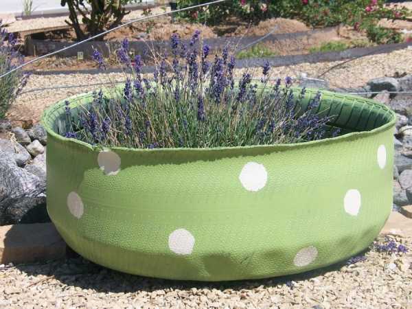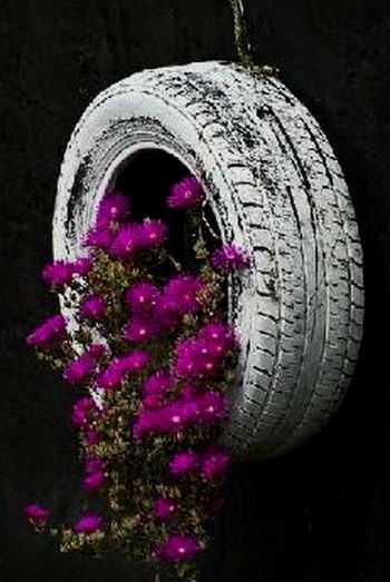 Из покрышек легко сооружаются цветочные вазоны. Можно использовать покрышку в «родном» облике или преобразить ее с помощью инструмента, вырезав ту или иную форму (волны, зубцы, лепестки). Технология проста: наносим на покрышке мелом схему, по которой будем резать острым ножом или лобзиком. После того как вырезали рисунок, выворачиваем покрышку наизнанку. В результате получаем симпатичную вазу. При желании красим ее снаружи в любой цвет, наполняем землей и высаживаем любимые цветы.