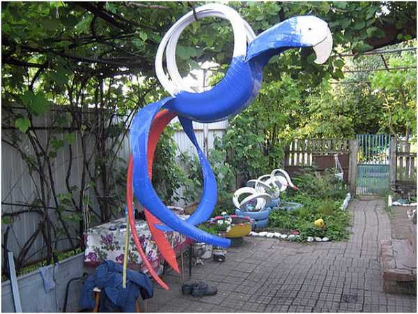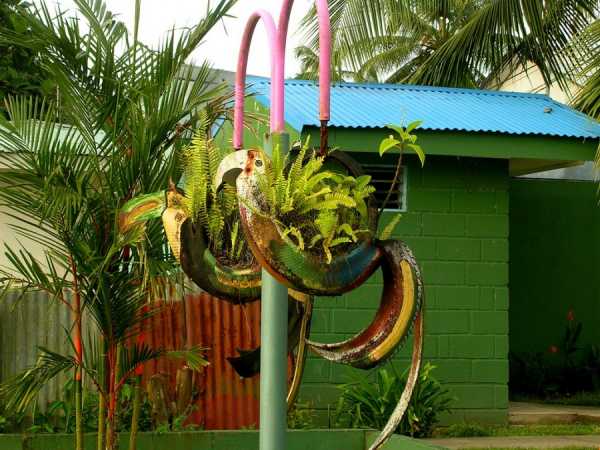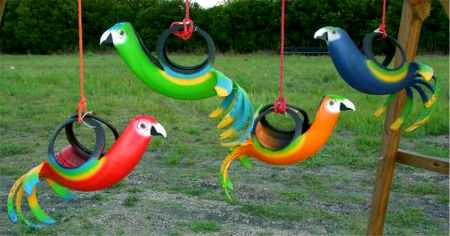 Посмотрите, как шикарно смотрится подвесная клумба в виде попугая. Разрезается покрышка лобзиком, и по предварительным отметкам раскрашивается фасадной краской.
