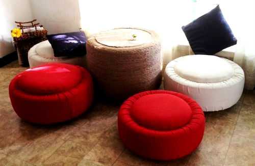 - две сложенные друг на друга покрышки, покрашенные в приятный оттенок и прикрытые мягким сидением – это уже удобный дачный пуф. В комплекте с ним можно использовать столик, выполненный из нескольких покрышек чуть меньшего диаметра, а в качестве столешницы подойдет лист фанеры или закаленного стекла;