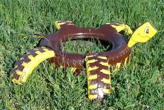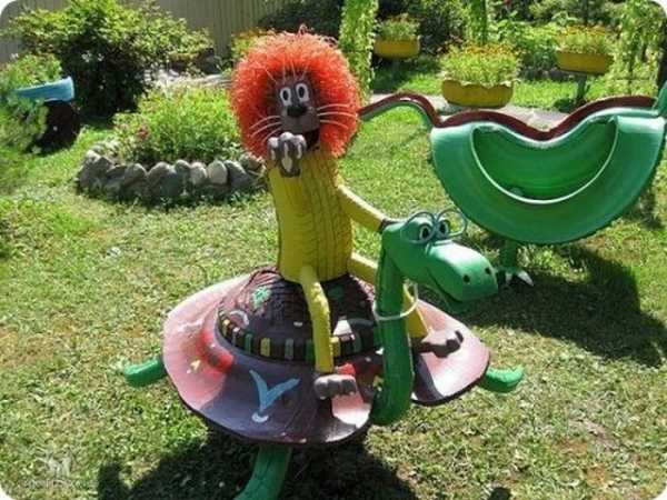 Дополнительные приспособления и инструменты помогут создать царевну-лягушку, оловянного солдатика или же красивого аиста. Художественным натурам по душе более сложные скульптуры из шин. Например, змей-горыныч. Множество мелких кусков резины прекрасно имитируют настоящие чешуйки.