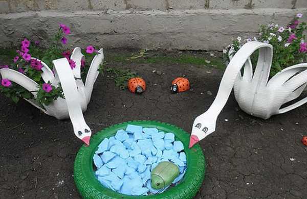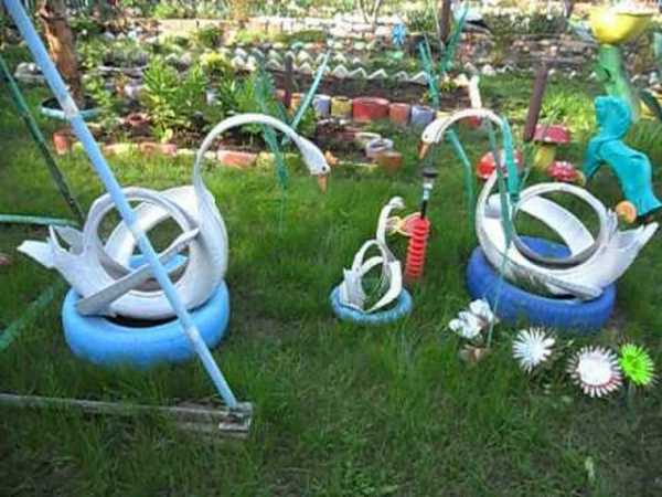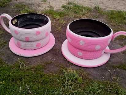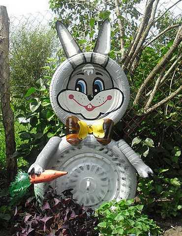 Умельцы изготавливают из старых шин действительно шикарные садовые украшения, среди которых: лебеди, божьи коровки, коровы, лягушки, чайные кружки и т.д.